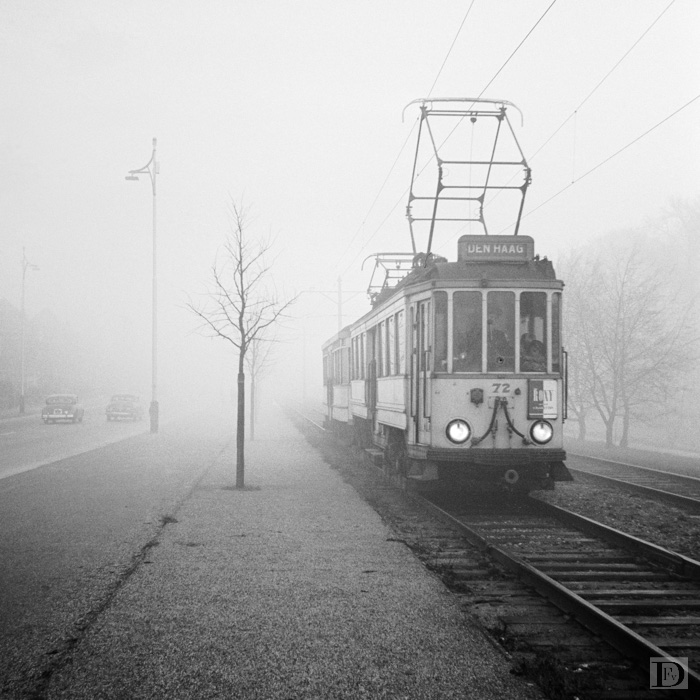 Tramstel van de tram naar Leiden op de Benoordenhoutseweg in dichte mist.