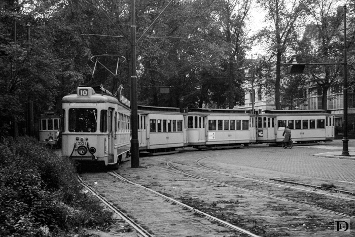 Een aardige combinatie draait bij de Frankenslag de Oude Scheveningseweg op. Dit krijg je, als er gelijktijdig een extra lijn 10 en drie aanhangwagentjes van lijn 1 moeten inrukken vanaf de Prins Mauritlslaan. Dat het gaat, bewijst deze opname !
