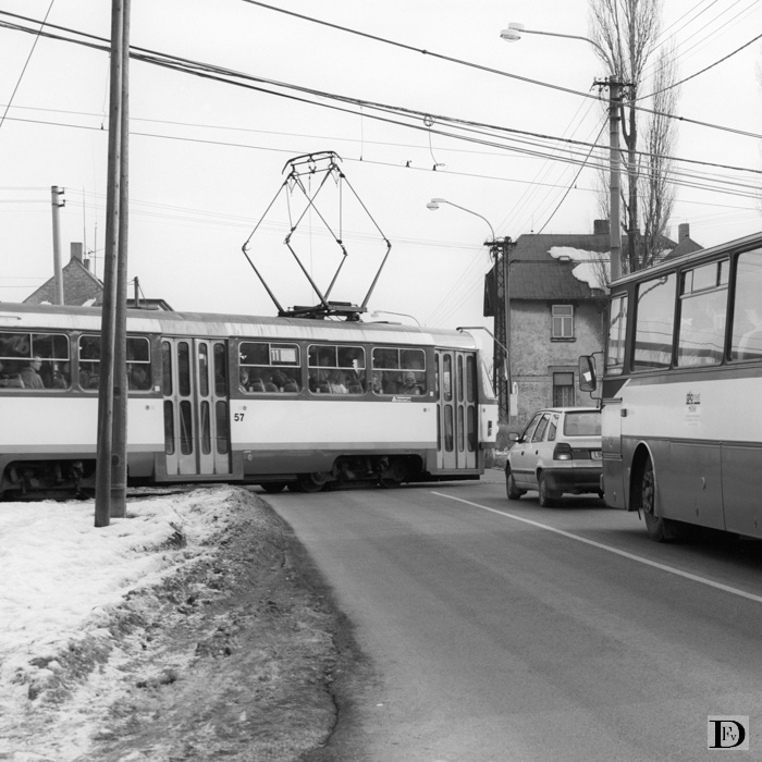 Nová Ruda, tram kruist de Tanvaldská. De overweg is beveiligd met spoorweg knipperlichten.