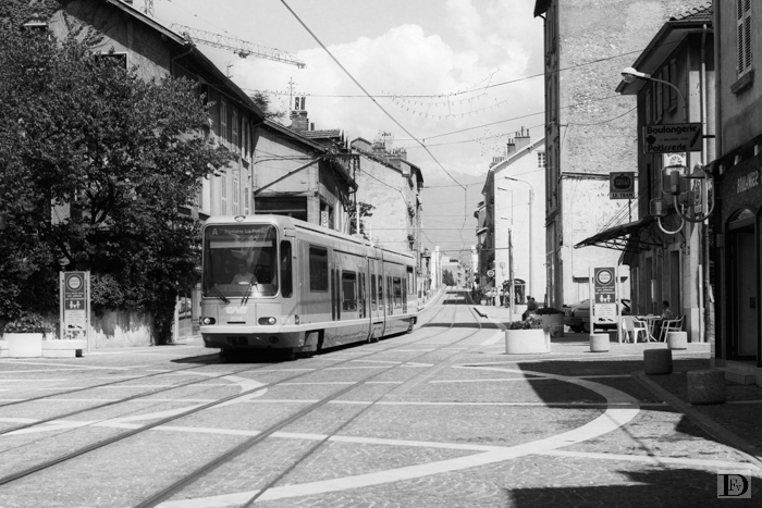 Fontaine, avenue Aristide Briand, vlak voor halte Gabriel Pétri, Les Fontainades. Let op de sierbestrating op het kruispunt.