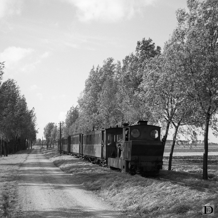 Stoomtram Numansdorp Haven - Rotterdam te Louter op de Reedijk, tussen Krooswijk en Blaakschedijk met loc 50 met vier rijtuigen 29 september 1956, trein 20.