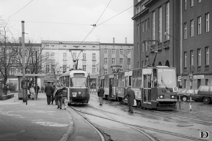 Links lijn 40: 162, rechts lijn 9: 721 + 722. Achter de lijn 40 een buiten dienste tram.