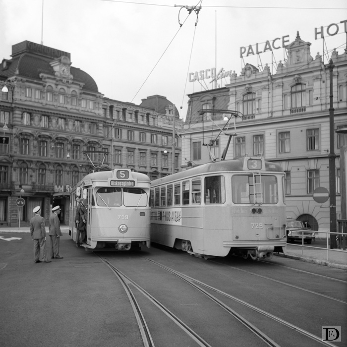 Hotellplatsen op Zweden's "dagen H". Het splitsingswissel tussen lijn 5 enerzijds en lijn 1, 3 en 7 anderzijds is nog niet elektrisch, doordat er nog te veel installaties in wissels zitten, die werden ingereden bij links verkeer. De twee controleurs staan de situatie eens aan te kijken en waar nodig instructie te geven op de eerste ochtend met rechtshoudend verkeer in Zweden.