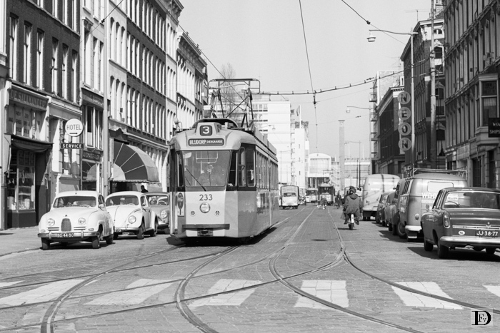 Oldenbarneveltstraat bij Mauritsweg met geleed motorrijtuig 233 op lijn 3 richting Blijdorp.