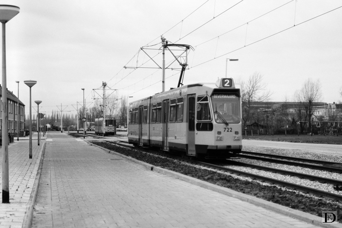 Lijn 2, 722 richting beginpunt Limbrichthoek. In de verte de 718 richting Charlois. Zaterdag 11 februari 1984.