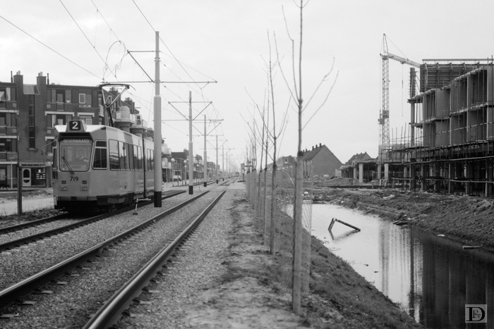 Beverwaard, Rhijnauwensingel met op de achtergrond halte Oude Wetering, gezien in zuidelijke richting. Lijn 2, 719, richting eindpunt Beverwaard.