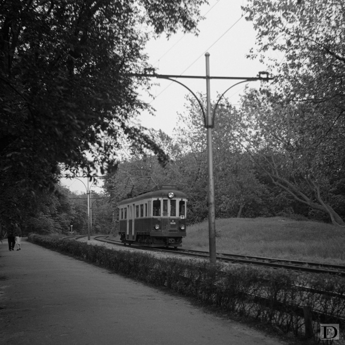 Motorrijtuig op de lijn Scheveningen - Voorburg rijd de Nieuwe Scheveningsche Bosjes (bij de Brusselselaan) in.
