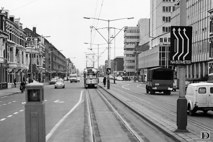 Laan van Nieuw Oost Indiƫ tussen Bezuidenhoutseweg (achter de fotograaf) en Theresiastraat. In beide richtingen worden de tramhaltes vrij van het verkeer gehouden d.m.v. een rijstrooksignalering.