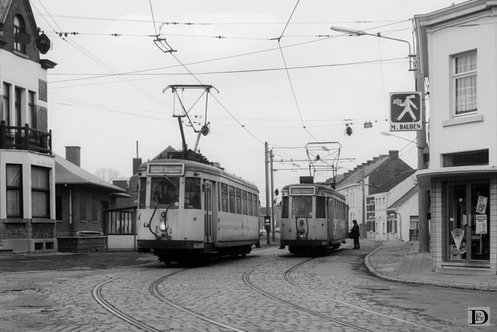Anderlues, Rue Jules Destrée met kruisende lijnen 30. De linker tram, S 9063, komt uit Bracquegnies, de rechter, S 9035, uit Anderlues.