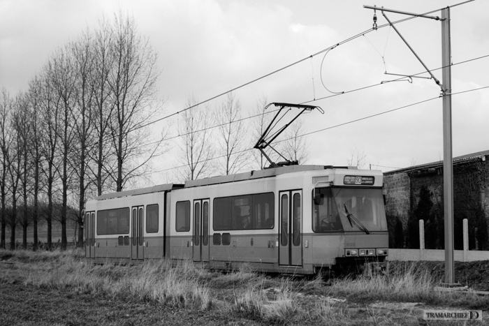 Nieuw geleed motorrijtuig 6128 op lijn 90 even voor Binche Cimétière. De tram rijdt van La Louvière naar Charleroi.