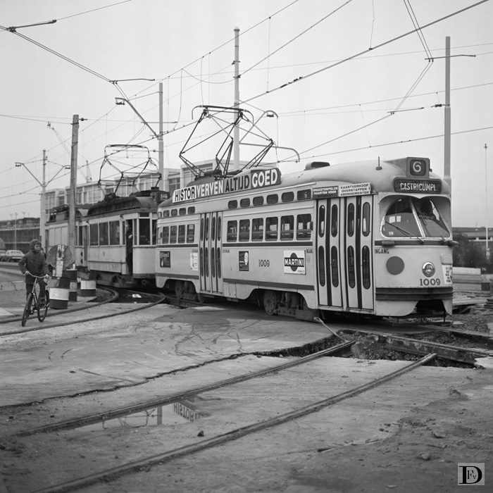 Lijn 6, PCC-car 1009, er achter ombouwer 36 + H 42, voor aanleg bovenleiding op het nieuwe traject.
