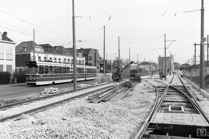 Links lijn 9, 3001, op de tijdelijke sporen in de straat.