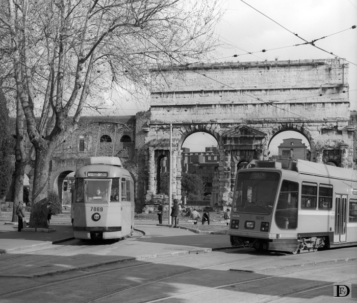 Links lijn 516, geleed rijtuig 7066, rechts 9015 als reserve tram voor lijn 30 / (doorstreept).