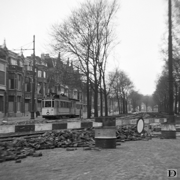 Statenlaan,aanleg tramsporen middenpad, februari 1952.