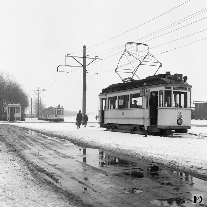 Het eindpunt Appelstraat (eigenlijk Alberdastraat) van lijn 5 met de weer in dienst gestelde ombouwer 36, de laatste van de gehele serie ! Op de achtergrond de aanhangwagens (type 900) voor het spitsuur.