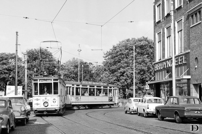 Tramstel van lijn 5 rijdt van de Prinsessegracht de Dr. Kuyperstraat in. 808 + 764, maandag 5 augustus 1963.