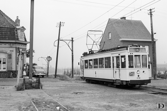 Station (NMVB) Belleghem met emr 9730 op de lijn Kortrijk - Moeskroen - Mont-à-Leux. Zaterdag 5 juli 1958. Serie 9729 - 9731, Famillereux, 1930. Deze rijtuigen waren 2,40 m. breed!