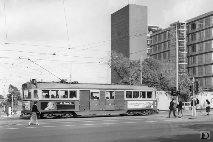 Deze tram heeft geen deuren maar rolgordijnen. De smalle middengang is ook nog aanwezig.