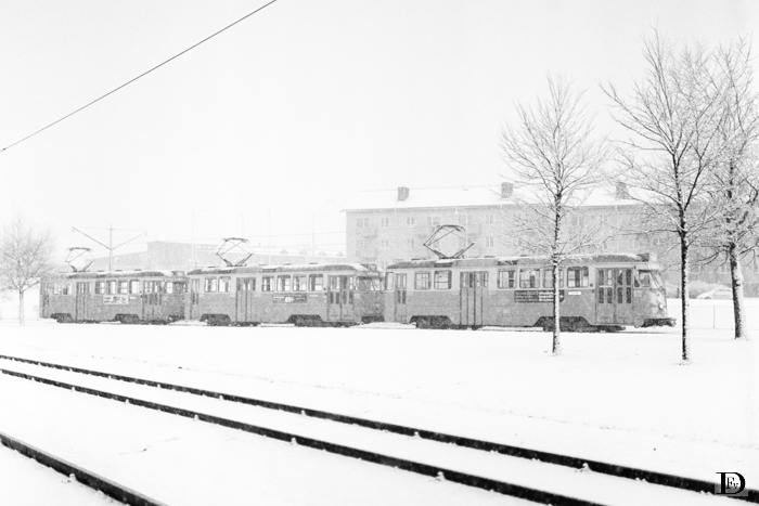 Driewagentram proef rijden voor versterkte dienst op lijn 2 tijdens benzinerantsoenering, Eketrägatan.