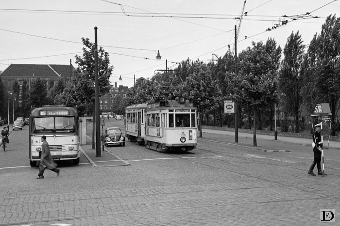 Het Korte Voorhout met lijn 3 (tram) en lijn 15 (bus) naast elkaar, wachtend op de verkeersagent.