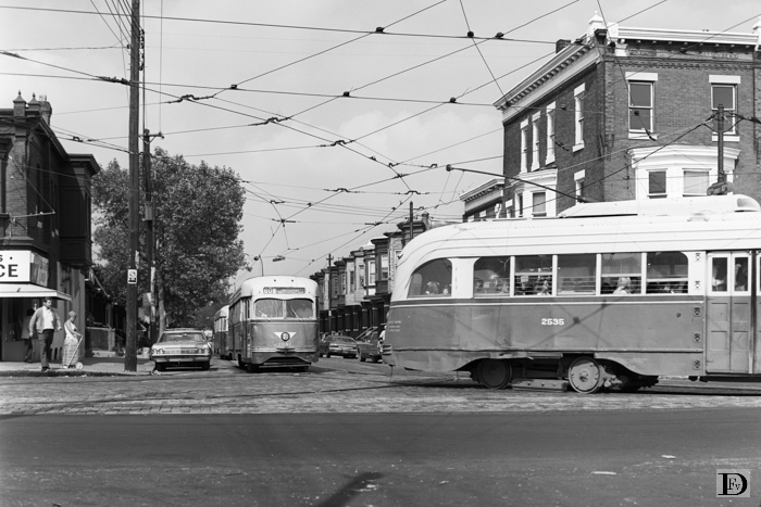 PCC car 2535 rijdt Erie Ave. op in oostelijke richting, PCC car 2581 in 10th St. als lijn 60 naar Richmond Westmoreland, daarachter PCC car 2559.