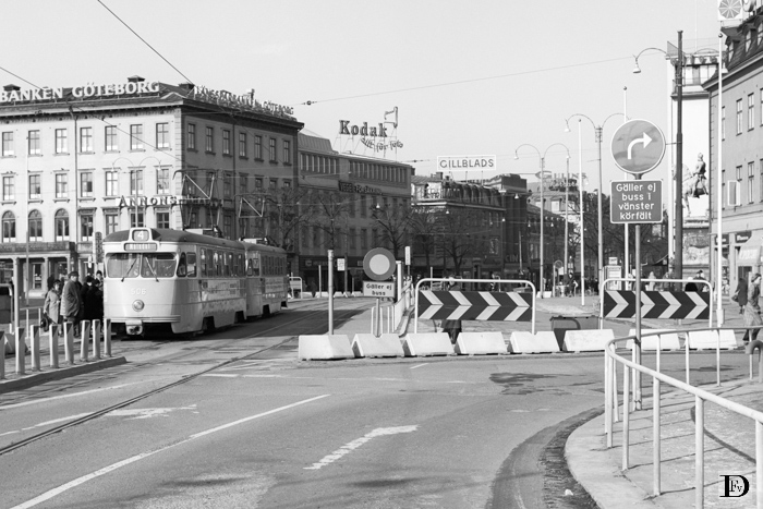Kungsportsplatsen na invoering van het verkeerscirculatiesysteem, waarbij de binnenstad in sectoren is ingedeeld.