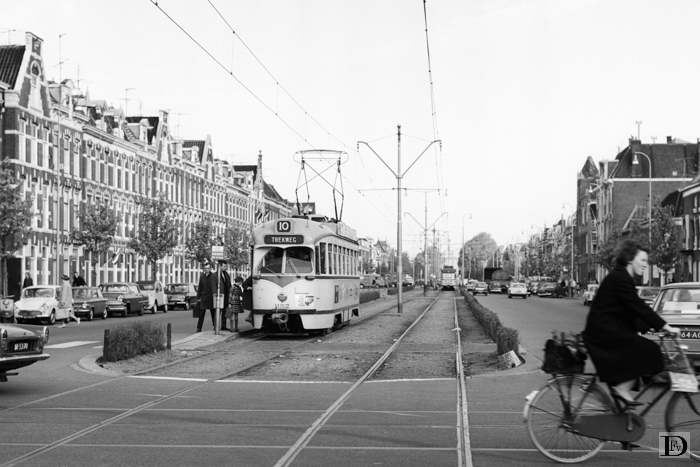 De Waldeck Pyrmontkade bij de Witte de Withstraat met een lijn 10, PCC-car 1152, aan de halte, op weg naar de Trekweg.