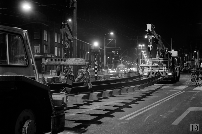 Aansluiting nieuwe sporen in het midden van de Rijswijkseweg bij de Van Musschenbroekstraat in de nacht van 26 op 27 januari (vrijdag op zaterdag). Dit waren de sporen richting Rijswijk; die richting Den Haag centrum werden de volgende nacht aangesloten.