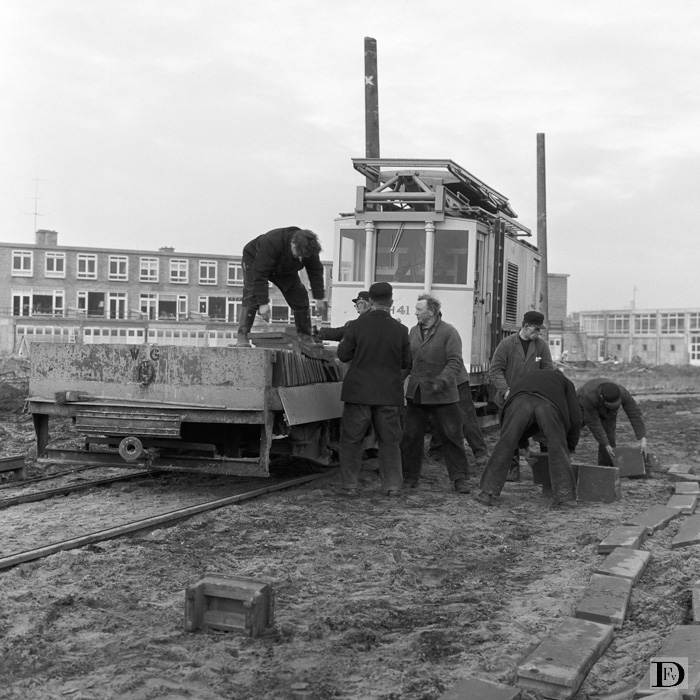 H 41 + W. & G. 1 werken aan aanleg tegelpad naar de beginhalte van lijn 6 in Mariahoeve.