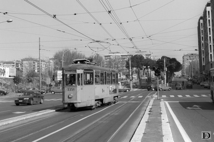 Lijn 13, 2251, komt van het Largo (en de keerlus) af aan en het begin van zijn rit naar Trastevere; op de achtergrond lijn 14 met "PCC" 8007.